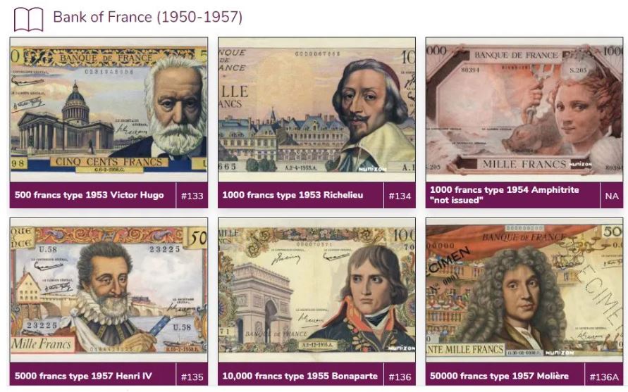 This new range comes as follows: a 500 francs Type 1953 Victor Hugo (Pick: #133), a 1000 francs Type 1953 Richelieu (Pick: #134), a 5000 francs Type 1957 Henri IV (Pick: #135), a 10000 francs Type 1955 Bonaparte (Pick: #136) and a 50000 francs Type 1957 Molière « non émis » (Pick: #136A). This last note will never be issued with this nominal value too important but will know another destiny with the reform of the franc that already happens …