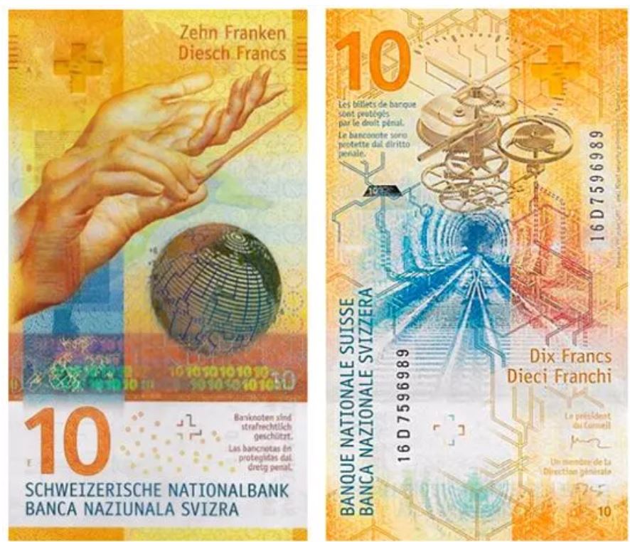Front and back: Multicolored print predominantly yellow. The main themes of the note are time and a sense of organization. These are materialized on the front by the hands of the conductor beating the measure with his wand and the time zones on the globe. The two themes are reproduced on the back with the clockwork mechanism, the Lötschberg tunnel, and the Swiss railway network. The value in figures “10” is printed in yellow on the left at the bottom of the front and on the top left on the back. The SNB’s translation texts are printed in horizontal blue on the front and vertically on the back and in four languages: Romansh, French, German and Italian.