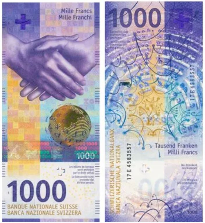 Front and back: Multicolored purple print. The main themes of the note are speech and the taste of communication. On the front, a handshake evokes human communication and on the surface of the globe, we can see phonetic signs. The value in figures “1000” is printed in purple on the left at the bottom of the front and on the top left on the back. The SNB’s translation texts are printed in yellow on the front and vertically on the back and in four languages: Romansh, French, German and Italian.