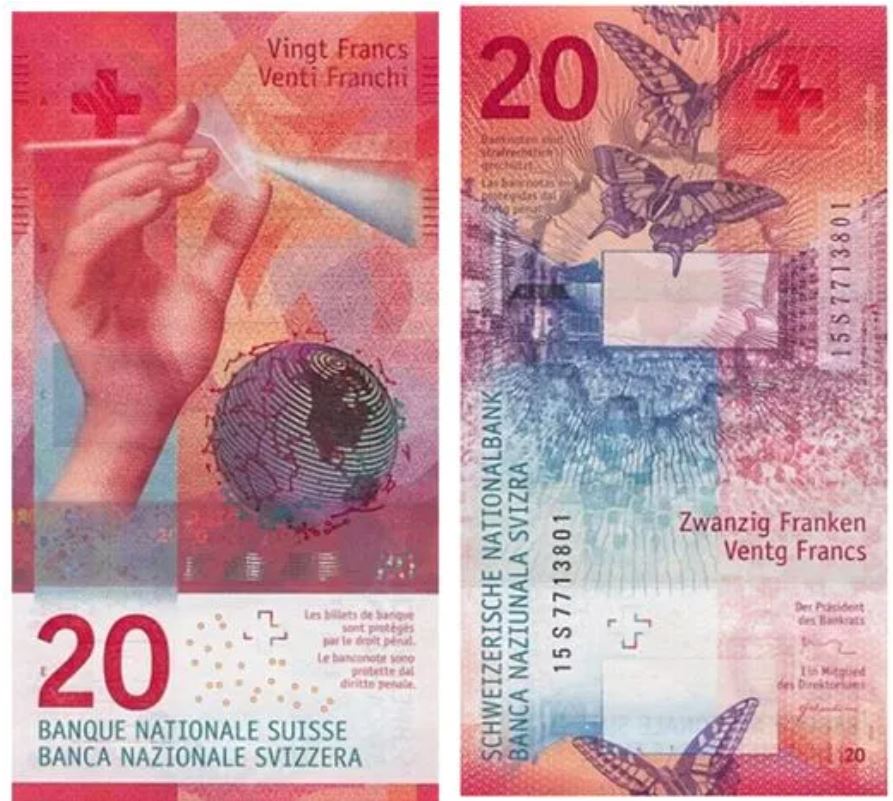 Front and back: Multicolored print predominantly red. The main themes of the note are light and creativity. The light is materialized on the front by a hand holding a prism and constellations on the globe. Both themes are illustrated on the back by the butterfly and a view of the Locarno Film Festival. The value in figures “20” is printed in red on the left at the bottom of the front and on the top left on the back. The SNB’s translation texts are printed in blue-green horizontally on the front and vertically on the back and in four languages: Romansh, French, German and Italian.