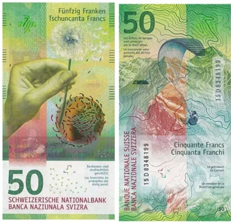 Front and back: Multicolored print predominantly green. The main themes of the note are wind and adventure. The wind is represented on the front by a hand holding a dandelion flower and the arrows indicating currents on the globe. The two themes are illustrated on the back by paragliding and the mountain in the background. The numerical value “50” is printed in green on the left at the bottom of the front and on the top left on the back. The SNB’s translation texts are printed in red on the front and vertically on the back and in four languages: Romansh, French, German, and Italian.
